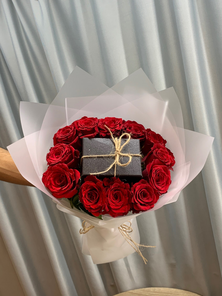 ⭐️بوكيه ساعة⭐️ساعة (رجالي/نسائي) ضمان سنةبوكيه ورد طبيعي احمرعبارة من اختيارك⭐️سيتم التواصل معك من اجل اختيار الساعة⭐️