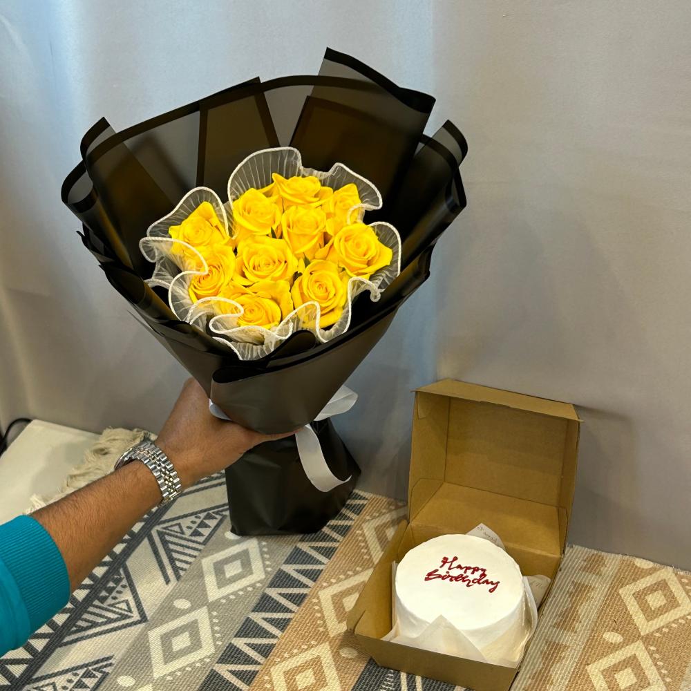 ⭐️جدة فقط⭐️كيك لانش مع كتابه من اختياركبوكيه ورد طبيعي ١٠ وردات مع تغليف راقيعبارة على كرت من اختيارك